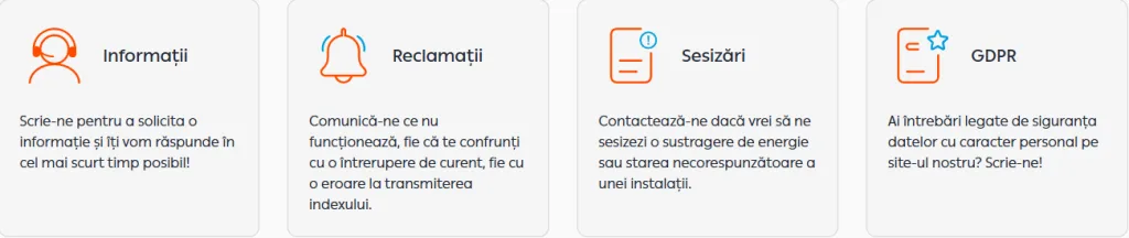 Se pot transmite reclamatii referitoare la tensiune, contoare, deconectari, sustrageri de energie, iluminat public, instalatii sau cereri de compensatii. Raspunsul va fi transmis cat mai curand posibil, prin e-mail sau in contul online.