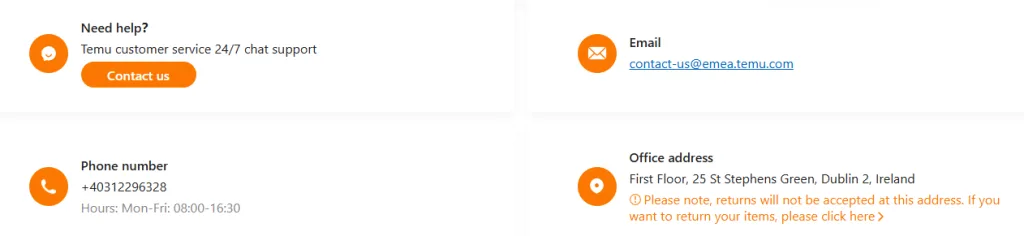 Sediul oficial Temu pentru operatiunile din Europa se afla la adresa: First Floor, 25 St Stephens Green, Dublin 2, Ireland.